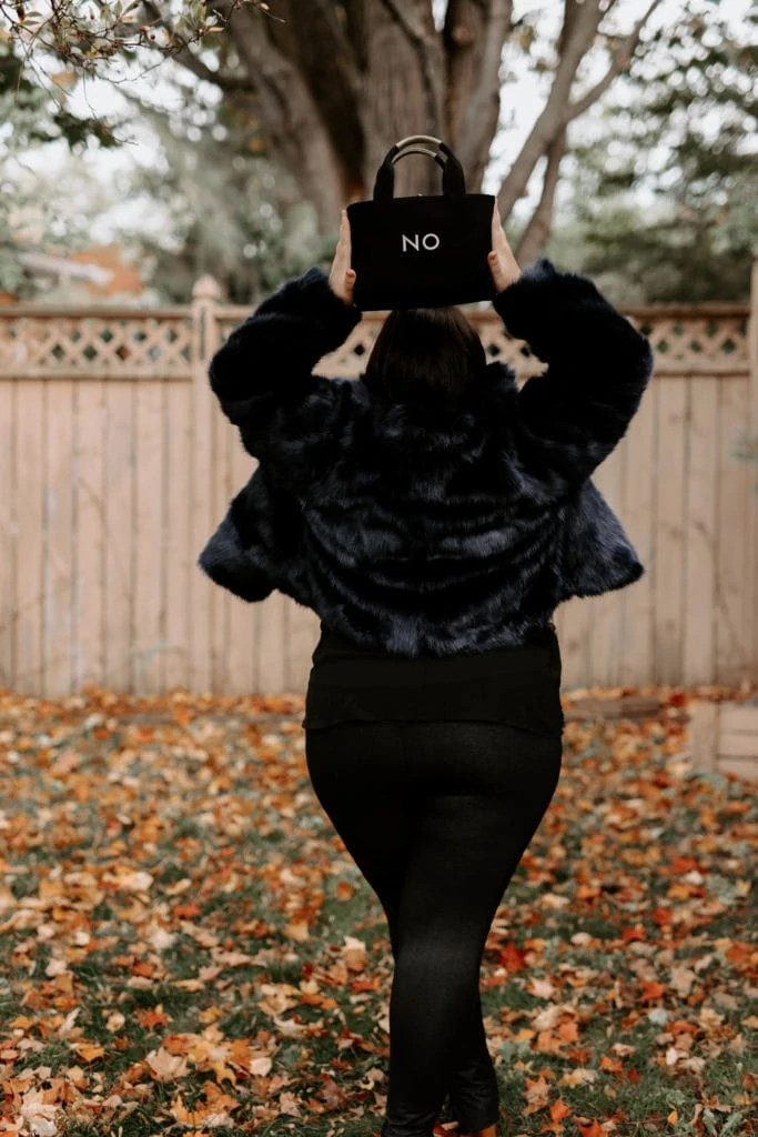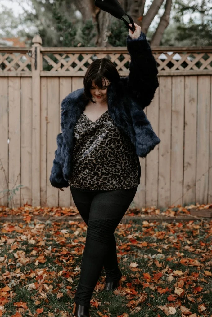 Jacket: Eloquii / Sequin Tank: Eloquii / Bag: Kate Spade via Valamode / Leggings: LNBF (discontinued, similar here) / Boots: gifted from a friend