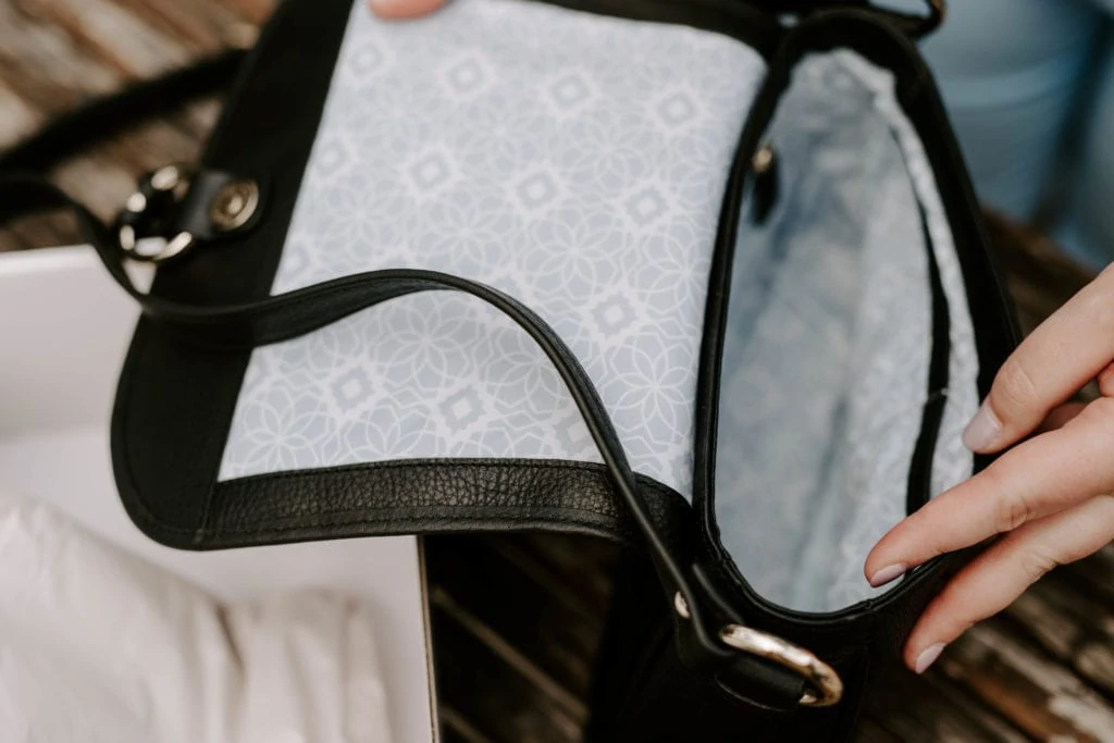 The interior is lined with a pale blue geometric floral-print fabric. There are two pockets at the front, one zippered pocket in the back, and a small insert perfectly sized for an ID card or transit pass. It snaps shut with a magnetic kiss-lock closure.