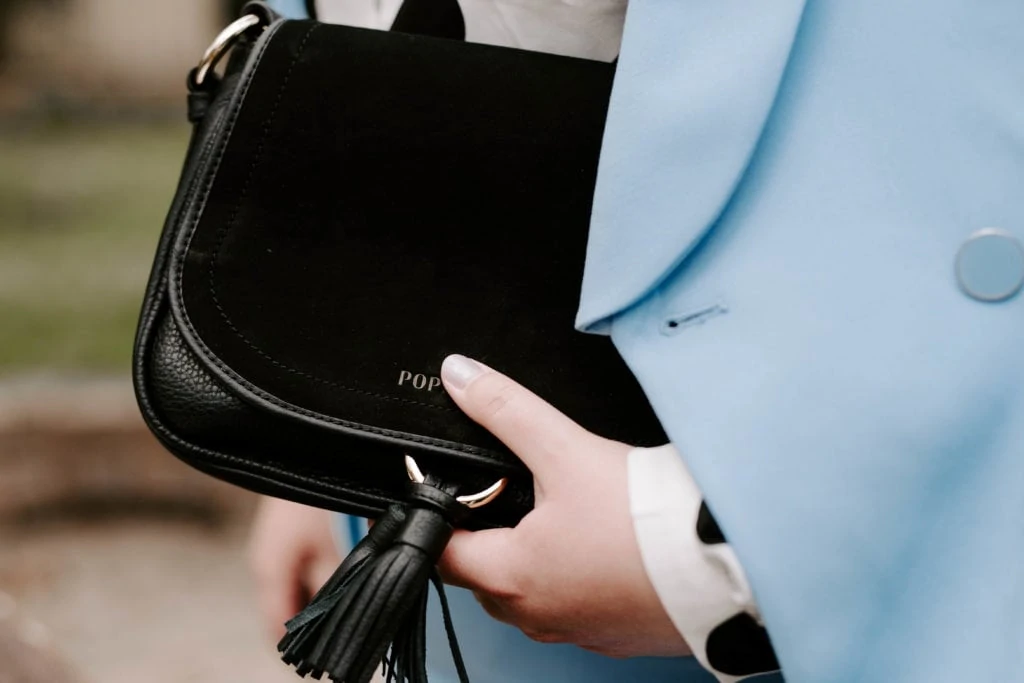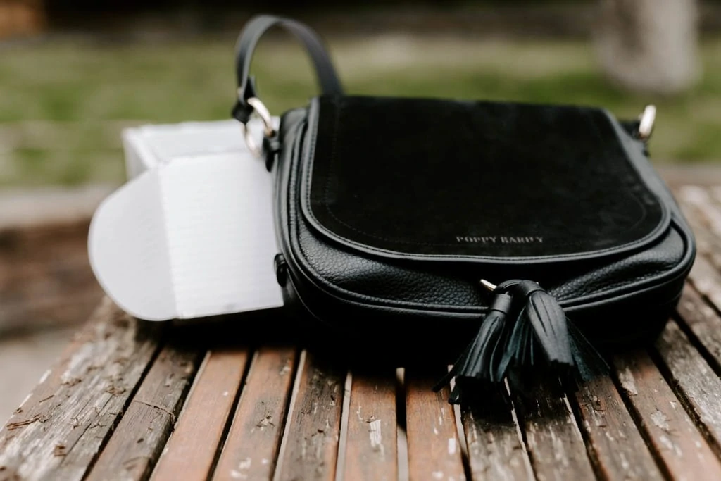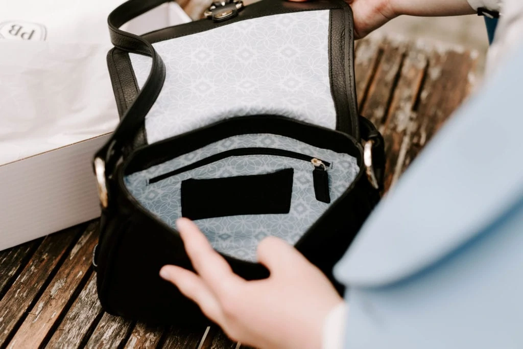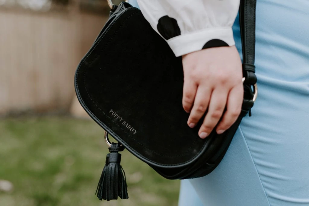 This bag is a beauty. Made from black pebbled leather with a jet black nubuck flap closure, it looks and feels beautiful. (Nubuck is like a softer version of suede that has an almost velvety feel.) The shoulder strap is adjustable, so you can wear it as a crossbody or as a shoulder bag according to your preference. I’ve set mine at a length that can work both ways.