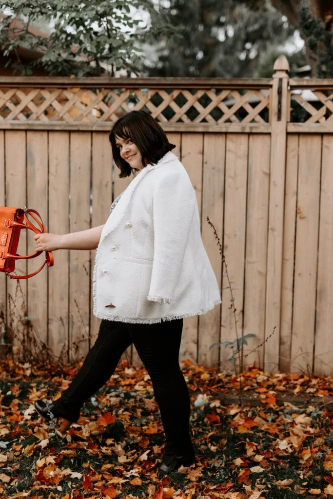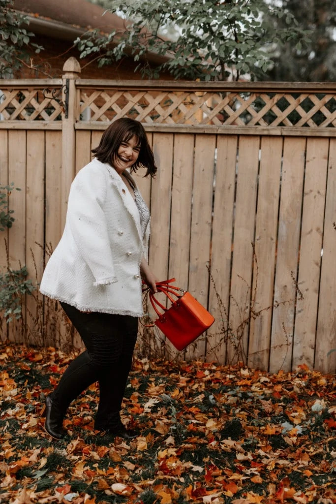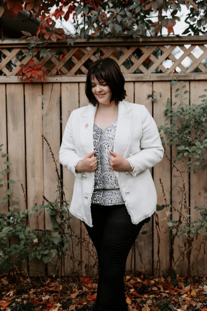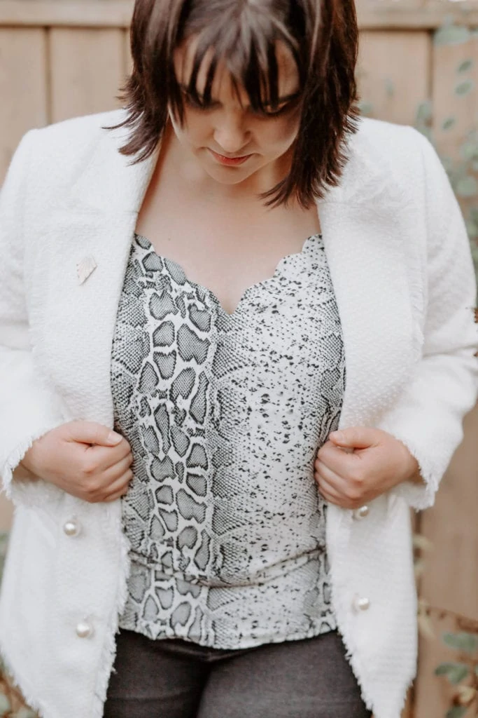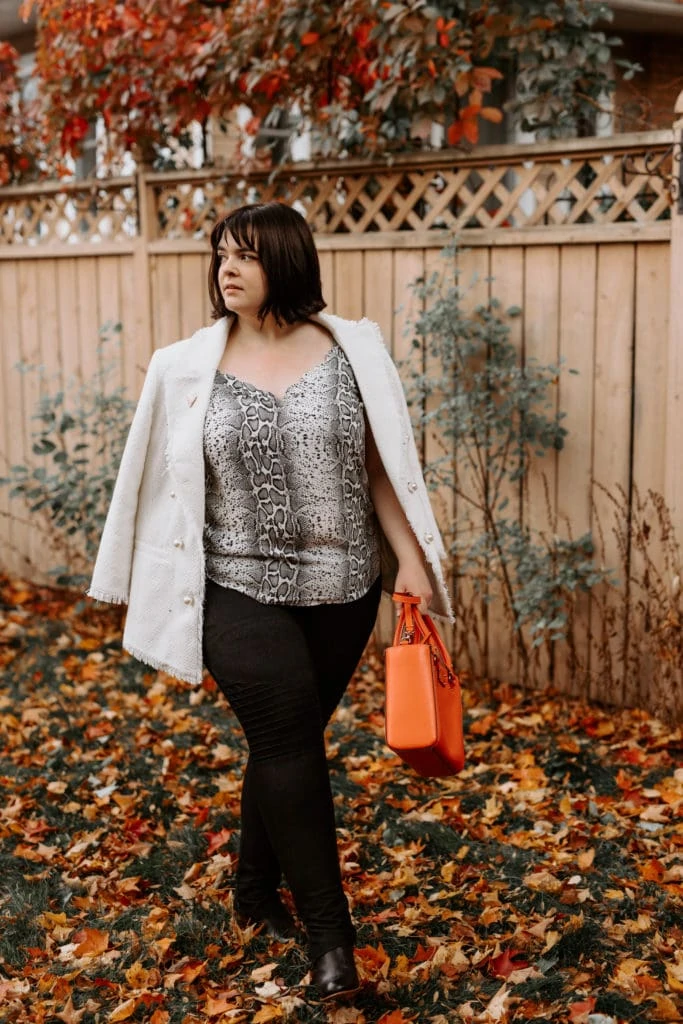 Giving my daily office uniform a little visual interest today with a healthy dose of snake print. Adding an animal-print cami is a great way to rock the trend without spending too much to update your wardrobe. The brightly coloured bag really helps to make this outfit pop.